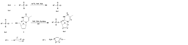 Novel phosphorylated derivatives of stavudine were synthesized by the reaction of bis(2-chloroethyl)phosphoramidic dichloride/4-nitrophenyl phosphorodichloridate with various cyclic amines and amino acid esters in the presence of triethylamine in dry tetrahydrofuran through the corresponding monochloride intermediates 2a-l. Further reaction of the intermediates 2a-l with stavudine in tetrahydrofuran and pyridine in the presence of triethylamine formed the title compounds 4a-l. Their structures were characterized by IR,   1H-, 13C-, 31P-NMR and mass spectral data analyses. They exhibited good antibacterial and antioxidant activities. Their bioactivity was greatly influenced by the different groups present at the phosphorus.