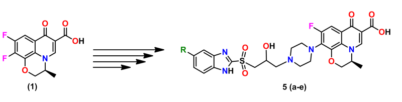 Synthesis of new β-hydroxy benzimidazolyl sulfides (4a-e) and β-hydroxy benzimidazolyl sulfones (5a-e) containing 7-piperazine fluoroquinolones have been described and evaluated for their antimicrobial activity. Benzoxazine fluoroquinolone carboxylic acid, 1, on reaction with piperazine in presence of triethylamine in acetonitrile under reflux resulted 7-piperazine bezoxazole fluoroquinolone, 2. The latter is reacted with epichlorohydrine in presence of NaOH in acetone yielded corresponding N-substituted epoxide, 3, with retained chirality, which on treatment with 5-substituted-2-mercaptobenzimidazoles given the corresponding β-hydroxy bezimidazolyl sulfides (4a-e). Further compounds 4a-e on treatment with H2O2 and ammonium molybdate in dichloromethane yielded the β-hydroxy bezimidazolyl sulfones, 5a-e. The antimicrobial activity of newly synthesized compounds along with levofloxacin (reference drug) were evaluated against different microorganisms and found many of the evaluated compounds have been exhibited remarkable activity.